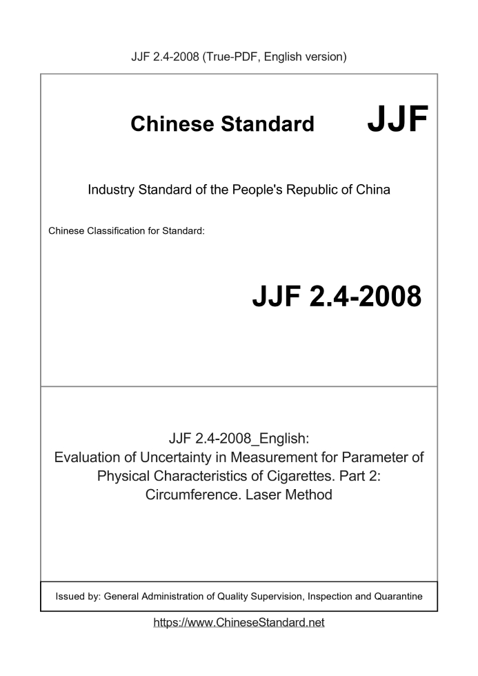 Basic dataStandard ID: JJF 2.4-2008 (JJF2.4-2008)Description (Translated English): Evaluation of Uncertainty in Measurement for Parameter of Physical Characteristics of Cigarettes. Part 2: Circumference. Laser Method Sector / Industry: Metrology & Measurement Industry Standard Issuing agency(ies): General Administration of Quality Supervision, Inspection and Quarantine Tips & Frequently Asked Questions:Question 1: How long will the true-PDF of JJF 2.4-2008_English be delivered?Answer: Upon your order, we will start to translate JJF 2.4-2008_English as soon as possible, and keep you informed of the progress. The lead time is typically 1 ~ 3 working days. The lengthier the document the longer the lead time.Question 2: Can I share the purchased PDF of JJF 2.4-2008_English with my colleagues?Answer: Yes. The purchased PDF of JJF 2.4-2008_English will be deemed to be sold to your employer/organization who actually pays for it, including your colleagues and your employer's intranet.Question 3: Does the price include tax/VAT?Answer: Yes. Our tax invoice, downloaded/delivered in 9 seconds, includes all tax/VAT and complies with 100+ countries' tax regulations (tax exempted in 100+ countries) -- See Avoidance of Double Taxation Agreements (DTAs): List of DTAs signed between Singapore and 100+ countriesQuestion 4: Do you accept my currency other than USD?Answer: Yes. If you need your currency to be printed on the invoice, please write an email to Sales@ChineseStandard.net. In 2 working-hours, we will create a special link for you to pay in any currencies. Otherwise, follow the normal steps: Add to Cart -- Checkout -- Select your currency to pay. |