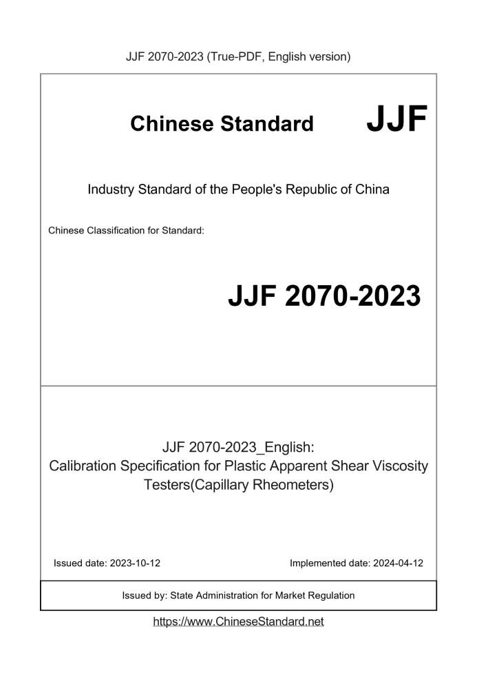 Delivery: <= 5 days. True-PDF full-copy in English will be manually translated and delivered via email. JJF 2070-2023: Calibration Specification for Plastic Apparent Shear Viscosity Testers(Capillary Rheometers) Status: Valid