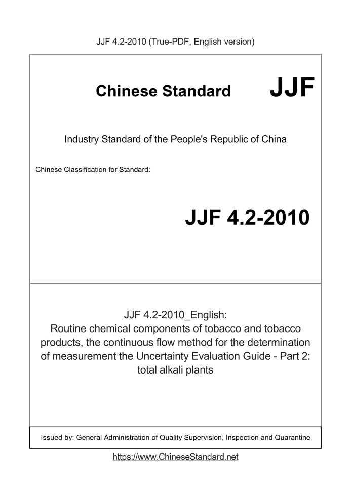 Basic dataStandard ID: JJF 4.2-2010 (JJF4.2-2010)Description (Translated English): Routine chemical components of tobacco and tobacco products, the continuous flow method for the determination of measurement the Uncertainty Evaluation Guide - Part 2: total alkali plants Sector / Industry: Metrology & Measurement Industry Standard Issuing agency(ies): General Administration of Quality Supervision, Inspection and Quarantine JJF 4.2-2010: Routine chemical components of tobacco and tobacco products, the continuous flow method for the determination of measurement the Uncertainty Evaluation Guide - Part 2: total alkali plants---This is a DRAFT version for illustration, not a final translation. Full copy of true-PDF in English version (including equations, symbols, images, flow-chart, tables, and figures etc.) will be manually/carefully translated upon your order. Routine chemical components of tobacco and tobacco products, the continuous flow method for the determination of measurement the Uncertainty Evaluation Guide - Part 2. total alkali plants Ministry of People's Republic of China Metrology Technical Specifications JJF (Tobacco) 4.2-2010 Continuous flow of tobacco and tobacco products Determination of conventional chemical composition measurement uncertainty Degree assessment guide Part 2. Total alkaloids Released on.2010-12-27 2011-01-15 implementation National Tobacco Monopoly Bureau released Continuous flow of tobacco and tobacco products Determination of conventional chemical composition measurement uncertainty Degree assessment guide Part 2. Total alkaloids Part 2. TotalAlkaloids JJF (Tobacco) 4.2-2010 This specification was approved by the State Tobacco Monopoly Bureau on December 27,.2010, and since January.2011 Implemented on the 15th. Focal Point. National Tobacco Monopoly Bureau Main drafting unit. National Tobacco Quality Supervision and Inspection Center Shanghai Tobacco (Group) Co., Ltd. Shenzhen Tobacco Industry Co., Ltd. Shandong China Tobacco Industry Co., Ltd. Technology Center Qingdao Workstation Jiangsu Zhongyan Industry Co., Ltd. Xuzhou Cigarette Factory Hongyun Honghe Tobacco (Group) Co., Ltd. This specification is interpreted by the National Tobacco Standardization Technical Committee. JJF (Tobacco) 4.2-2010 The main drafters of this specification. Zhang Wei Flashing red light Participate in the drafters. Ma Yong Sui Dynasty Xu Ruyan Stone red geese Wang Lu Yang Yanping JJF (Tobacco) 4.2-2010 table of Contents1 Scope (1) 2 Citations (1) 3 Basic terms and concepts (1) 4 Mathematical models and uncertainty components (1) 5 synthetic standard uncertainty (6) 6 Extended uncertainty (6) Appendix A Standard Uncertainty Evaluation of Fitting Curve Parameters (7) JJF (Tobacco) 4.2-2010 Continuous flow of tobacco and tobacco products Determination of conventional chemical composition measurement uncertainty Degree assessment guide Part 2. Total alkaloids1 ScopeThe uncertainty assessment procedure provided by this specification is used to guide the continuous flow measurement of tobacco and tobacco products. Evaluation of the uncertainty of measurement of total plant alkali of chemical components.2 CitationsThis specification refers to the following documents. JJF 1059 Measurement Uncertainty Evaluation and Representation YC/T 31 Preparation of tobacco and tobacco product samples and moisture determination oven method YC/T 160 Tobacco and tobacco products - Determination of total alkaloids - Continuous flow method Use of this specification should be done with the current valid version of the above cited documents.3 basic terms and conceptsThe relevant terms and definitions given in JJF 1059, YC/T 31, and YC/T 160 apply to this specification.4 Mathematical models and uncertainty components4.1 Mathematical model of the measurement process From YC/T 160, the mathematical model of the total alkaloids of tobacco and tobacco products tested is shown in equation (1). TA=RT.A±RT.A× [urel(m)]2 [urel(W)]2 [urel(V)]2 [urel(C)]2 [urel(rep)]2 (1) In the formula. TA---total amount of plant alkali; RT.A---Measurement of total alkaloids; Urel(m)---the relative amount of influence introduced by sample quality measurement; Urel(W)---the relative amount of influence introduced by sample moisture measurement; Urel(V)--the relative amount of influence introduced by the volume measurement of the extract; Urel(C)---the relative amount of influence introduced by sample concentration measurement; Urel(rep)---Measures the relative amount of influence introduced by repeatability. 4.2 Uncertainty component evaluation 4.2.1 Uncertainty component introduced by sample quality measurement, urel(m) JJF (Tobacco) 4.2-2010 ......Tips & Frequently Asked Questions:Question 1: How long will the true-PDF of JJF 4.2-2010_English be delivered?Answer: Upon your order, we will start to translate JJF 4.2-2010_English as soon as possible, and keep you informed of the progress. The lead time is typically 1 ~ 3 working days. The lengthier the document the longer the lead time.Question 2: Can I share the purchased PDF of JJF 4.2-2010_English with my colleagues?Answer: Yes. The purchased PDF of JJF 4.2-2010_English will be deemed to be sold to your employer/organization who actually pays for it, including your colleagues and your employer's intranet.Question 3: Does the price include tax/VAT?Answer: Yes. Our tax invoice, downloaded/delivered in 9 seconds, includes all tax/VAT and complies with 100+ countries' tax regulations (tax exempted in 100+ countries) -- See Avoidance of Double Taxation Agreements (DTAs): List of DTAs signed between Singapore and 100+ countriesQuestion 4: Do you accept my currency other than USD?Answer: Yes. If you need your currency to be printed on the invoice, please write an email to Sales@ChineseStandard.net. In 2 working-hours, we will create a special link for you to pay in any currencies. Otherwise, follow the normal steps: Add to Cart -- Checkout -- Select your currency to pay. |