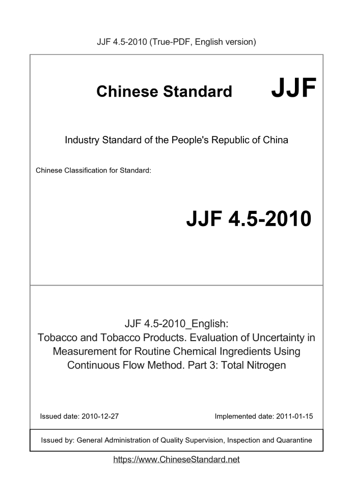 Basic dataStandard ID: JJF 4.5-2010 (JJF4.5-2010)Description (Translated English): Tobacco and Tobacco Products. Evaluation of Uncertainty in Measurement for Routine Chemical Ingredients Using Continuous Flow Method. Part 3: Total Nitrogen Sector / Industry: Metrology & Measurement Industry Standard Date of Issue: 2010-12-27 Date of Implementation: 2011-01-15 Issuing agency(ies): General Administration of Quality Supervision, Inspection and Quarantine JJF 4.5-2010: Tobacco and Tobacco Products. Evaluation of Uncertainty in Measurement for Routine Chemical Ingredients Using Continuous Flow Method. Part 3: Total Nitrogen---This is a DRAFT version for illustration, not a final translation. Full copy of true-PDF in English version (including equations, symbols, images, flow-chart, tables, and figures etc.) will be manually/carefully translated upon your order. Tobacco and Tobacco Products.Evaluation of Uncertainty in Measurement for Routine Chemical Ingredients Using Continuous Flow Method.Part 3. Total Nitrogen Ministry of People's Republic of China Metrology Technical Specifications JJF (Tobacco) 4.5-2010 Continuous flow of tobacco and tobacco products Determination of conventional chemical composition measurement uncertainty Degree assessment guide Part 5. Potassium Part 5. Potassium Released on.2010-12-27 2011-01-15 implementation National Tobacco Monopoly Bureau released Continuous flow of tobacco and tobacco products Determination of conventional chemical composition measurement uncertainty Degree assessment guide Part 5. Potassium EvaluationofUncertaintyinMeasurementfor RoutineChemicalIngredientsUsing ContinuousFlowMethod- Part 5. Potassium JJF (Tobacco) 4.5-2010 This specification was approved by the State Tobacco Monopoly Bureau on December 27,.2010, and since January.2011 Implemented on the 15th. Focal Point. National Tobacco Monopoly Bureau Main drafting unit. National Tobacco Quality Supervision and Inspection Center Shanghai Tobacco (Group) Co., Ltd. Shenzhen Tobacco Industry Co., Ltd. Shandong China Tobacco Industry Co., Ltd. Technology Center Qingdao Workstation Jiangsu Zhongyan Industry Co., Ltd. Xuzhou Cigarette Factory Hongyun Honghe Tobacco (Group) Co., Ltd. This specification is interpreted by the National Tobacco Standardization Technical Committee. JJF (Tobacco) 4.5-2010 The main drafters of this specification. Wang Ying Chen Zaigen Participate in the drafters. Wang Lu Sui Dynasty Wang Xiaochun Stone red geese Zhang De JJF (Tobacco) 4.5-2010 table of Contents1 Scope (1) 2 Citations (1) 3 Basic terms and concepts (1) 4 Mathematical models and uncertainty components (1) 5 synthetic standard uncertainty (6) 6 Extended uncertainty (6) Appendix A Standard Uncertainty Evaluation of Fitting Curve Parameters (7) JJF (Tobacco) 4.5-2010 Continuous flow of tobacco and tobacco products Determination of conventional chemical composition measurement uncertainty Degree assessment guide Part 5. Potassium1 ScopeThe uncertainty assessment procedure provided by this specification is used to guide the continuous flow measurement of tobacco and tobacco products. Evaluation of chemical composition potassium measurement uncertainty.2 CitationsThis specification refers to the following documents. JJF 1059 Measurement Uncertainty Evaluation and Representation YC/T 31 Preparation of tobacco and tobacco product samples and moisture determination oven method YC/T 217 Determination of potassium in tobacco and tobacco products - Continuous flow method Use of this specification should be done with the current valid version of the above cited documents.3 basic terms and conceptsThe relevant terms and definitions given in JJF 1059, YC/T 31, and YC/T 217 apply to this specification.4 Mathematical models and uncertainty components4.1 Mathematical model of the measurement process From YC/T 217, the mathematical model of the tested potassium of tobacco and tobacco products is shown in equation (1). POT=RPOT±RPOT× [urel(m)]2 [urel(W)]2 [urel(V)]2 [urel(C)]2 [urel(rep)]2 (1) In the formula. POT---potassium amount; RPOT---the measured value of potassium; Urel(m)---the relative amount of influence introduced by sample quality measurement; Urel(W)---the relative amount of influence introduced by sample moisture measurement; Urel(V)--the relative amount of influence introduced by the volume measurement of the extract; Urel(C)---the relative amount of influence introduced by sample concentration measurement; Urel(rep)---Measures the relative amount of influence introduced by repeatability. 4.2 Uncertainty component evaluation 4.2.1 Uncertainty component introduced by sample quality measurement, urel(m) JJF (Tobacco) 4.5-2010 ......Tips & Frequently Asked Questions:Question 1: How long will the true-PDF of JJF 4.5-2010_English be delivered?Answer: Upon your order, we will start to translate JJF 4.5-2010_English as soon as possible, and keep you informed of the progress. The lead time is typically 1 ~ 3 working days. The lengthier the document the longer the lead time.Question 2: Can I share the purchased PDF of JJF 4.5-2010_English with my colleagues?Answer: Yes. The purchased PDF of JJF 4.5-2010_English will be deemed to be sold to your employer/organization who actually pays for it, including your colleagues and your employer's intranet.Question 3: Does the price include tax/VAT?Answer: Yes. Our tax invoice, downloaded/delivered in 9 seconds, includes all tax/VAT and complies with 100+ countries' tax regulations (tax exempted in 100+ countries) -- See Avoidance of Double Taxation Agreements (DTAs): List of DTAs signed between Singapore and 100+ countriesQuestion 4: Do you accept my currency other than USD?Answer: Yes. If you need your currency to be printed on the invoice, please write an email to Sales@ChineseStandard.net. In 2 working-hours, we will create a special link for you to pay in any currencies. Otherwise, follow the normal steps: Add to Cart -- Checkout -- Select your currency to pay. |