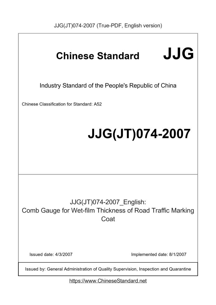 Basic dataStandard ID: JJG(JT)074-2007 (JJG(JT)074-2007)Description (Translated English): Comb Gauge for Wet-film Thickness of Road Traffic Marking Coat Sector / Industry: Metrology & Measurement Industry Standard Classification of Chinese Standard: A52 Classification of International Standard: 17.040.30 Word Count Estimation: 11,129 Date of Issue: 4/3/2007 Date of Implementation: 8/1/2007 Quoted Standard: GB/T 11337-2004; GB/T 16311-2005; JT/T 476-2007 Regulation (derived from): National Metrology technical regulations Directory 2014 Version Issuing agency(ies): General Administration of Quality Supervision, Inspection and Quarantine Summary: This standard applies to road traffic marking coatings comb wet film thickness gauge (hereinafter referred to as "comb Regulation") of the initial verification, testing and use of follow-up inspection. Tips & Frequently Asked Questions:Question 1: How long will the true-PDF of JJG(JT)074-2007_English be delivered?Answer: Upon your order, we will start to translate JJG(JT)074-2007_English as soon as possible, and keep you informed of the progress. The lead time is typically in 9 seconds (download/delivered in 9 seconds). The lengthier the document the longer the lead time.Question 2: Can I share the purchased PDF of JJG(JT)074-2007_English with my colleagues?Answer: Yes. The purchased PDF of JJG(JT)074-2007_English will be deemed to be sold to your employer/organization who actually pays for it, including your colleagues and your employer's intranet.Question 3: Does the price include tax/VAT?Answer: Yes. Our tax invoice, downloaded/delivered in 9 seconds, includes all tax/VAT and complies with 100+ countries' tax regulations (tax exempted in 100+ countries) -- See Avoidance of Double Taxation Agreements (DTAs): List of DTAs signed between Singapore and 100+ countriesQuestion 4: Do you accept my currency other than USD?Answer: Yes. If you need your currency to be printed on the invoice, please write an email to Sales@ChineseStandard.net. In 2 working-hours, we will create a special link for you to pay in any currencies. Otherwise, follow the normal steps: Add to Cart -- Checkout -- Select your currency to pay. |