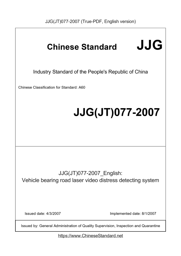 Basic dataStandard ID: JJG(JT)077-2007 (JJG(JT)077-2007)Description (Translated English): Vehicle bearing road laser video distress detecting system Sector / Industry: Metrology & Measurement Industry Standard Classification of Chinese Standard: A60 Classification of International Standard: 17.180.30 Word Count Estimation: 13,125 Date of Issue: 4/3/2007 Date of Implementation: 8/1/2007 Quoted Standard: JTJ 059; JT/T 678-2007 Regulation (derived from): ?Ministry of Transport Announcement 2015 No.28 Issuing agency(ies): General Administration of Quality Supervision, Inspection and Quarantine Summary: This standard applies to vehicle-mounted laser as the road is quite Disease Detection System (hereinafter referred to as laser video sickly detection system) for initial verification, testing and use of the follow-up inspection. Tips & Frequently Asked Questions:Question 1: How long will the true-PDF of JJG(JT)077-2007_English be delivered?Answer: Upon your order, we will start to translate JJG(JT)077-2007_English as soon as possible, and keep you informed of the progress. The lead time is typically in 9 seconds (download/delivered in 9 seconds). The lengthier the document the longer the lead time.Question 2: Can I share the purchased PDF of JJG(JT)077-2007_English with my colleagues?Answer: Yes. The purchased PDF of JJG(JT)077-2007_English will be deemed to be sold to your employer/organization who actually pays for it, including your colleagues and your employer's intranet.Question 3: Does the price include tax/VAT?Answer: Yes. Our tax invoice, downloaded/delivered in 9 seconds, includes all tax/VAT and complies with 100+ countries' tax regulations (tax exempted in 100+ countries) -- See Avoidance of Double Taxation Agreements (DTAs): List of DTAs signed between Singapore and 100+ countriesQuestion 4: Do you accept my currency other than USD?Answer: Yes. If you need your currency to be printed on the invoice, please write an email to Sales@ChineseStandard.net. In 2 working-hours, we will create a special link for you to pay in any currencies. Otherwise, follow the normal steps: Add to Cart -- Checkout -- Select your currency to pay. |