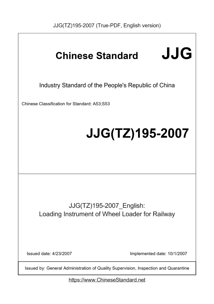 Basic dataStandard ID: JJG(TZ)195-2007 (JJG(TZ)195-2007)Description (Translated English): Loading Instrument of Wheel Loader for Railway Sector / Industry: Metrology & Measurement Industry Standard Classification of Chinese Standard: A53;S53 Classification of International Standard: 17.060; 45.060 Word Count Estimation: 13,122 Date of Issue: 4/23/2007 Date of Implementation: 10/1/2007 Quoted Standard: JJG 539-1997; JJG 648-1996; JJG 907-2003 Issuing agency(ies): General Administration of Quality Supervision, Inspection and Quarantine Summary: This standard applies to the installation of the railway yard and other handling establishments used for controlling the loading wheel loader wheel loader loading monitor the initial verification, testing and use of the follow-up inspection. Tips & Frequently Asked Questions:Question 1: How long will the true-PDF of JJG(TZ)195-2007_English be delivered?Answer: Upon your order, we will start to translate JJG(TZ)195-2007_English as soon as possible, and keep you informed of the progress. The lead time is typically in 9 seconds (download/delivered in 9 seconds). The lengthier the document the longer the lead time.Question 2: Can I share the purchased PDF of JJG(TZ)195-2007_English with my colleagues?Answer: Yes. The purchased PDF of JJG(TZ)195-2007_English will be deemed to be sold to your employer/organization who actually pays for it, including your colleagues and your employer's intranet.Question 3: Does the price include tax/VAT?Answer: Yes. Our tax invoice, downloaded/delivered in 9 seconds, includes all tax/VAT and complies with 100+ countries' tax regulations (tax exempted in 100+ countries) -- See Avoidance of Double Taxation Agreements (DTAs): List of DTAs signed between Singapore and 100+ countriesQuestion 4: Do you accept my currency other than USD?Answer: Yes. If you need your currency to be printed on the invoice, please write an email to Sales@ChineseStandard.net. In 2 working-hours, we will create a special link for you to pay in any currencies. Otherwise, follow the normal steps: Add to Cart -- Checkout -- Select your currency to pay. |