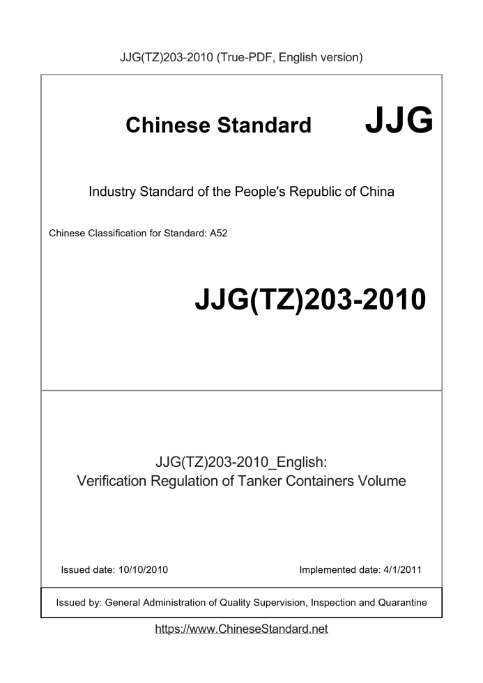 Basic dataStandard ID: JJG(TZ)203-2010 (JJG(TZ)203-2010)Description (Translated English): Verification Regulation of Tanker Containers Volume Sector / Industry: Metrology & Measurement Industry Standard Classification of Chinese Standard: A52 Classification of International Standard: 17.06 Word Count Estimation: 26,236 Date of Issue: 10/10/2010 Date of Implementation: 4/1/2011 Quoted Standard: JJF 1001-1998; JJF 1009-2006; JJF 1059-1999; GB/T 1413-2008; GB/T 1836-1997; GB/T 1992-2006 Regulation (derived from): ?Railway-Science (2010) 183 Issuing agency(ies): General Administration of Quality Supervision, Inspection and Quarantine Summary: This standard applies to the shipment of liquid products, the tank container rail transport volume of initial verification and follow-up test, the other tank container may refer to. Tips & Frequently Asked Questions:Question 1: How long will the true-PDF of JJG(TZ)203-2010_English be delivered?Answer: Upon your order, we will start to translate JJG(TZ)203-2010_English as soon as possible, and keep you informed of the progress. The lead time is typically in 9 seconds (download/delivered in 9 seconds). The lengthier the document the longer the lead time.Question 2: Can I share the purchased PDF of JJG(TZ)203-2010_English with my colleagues?Answer: Yes. The purchased PDF of JJG(TZ)203-2010_English will be deemed to be sold to your employer/organization who actually pays for it, including your colleagues and your employer's intranet.Question 3: Does the price include tax/VAT?Answer: Yes. Our tax invoice, downloaded/delivered in 9 seconds, includes all tax/VAT and complies with 100+ countries' tax regulations (tax exempted in 100+ countries) -- See Avoidance of Double Taxation Agreements (DTAs): List of DTAs signed between Singapore and 100+ countriesQuestion 4: Do you accept my currency other than USD?Answer: Yes. If you need your currency to be printed on the invoice, please write an email to Sales@ChineseStandard.net. In 2 working-hours, we will create a special link for you to pay in any currencies. Otherwise, follow the normal steps: Add to Cart -- Checkout -- Select your currency to pay. |