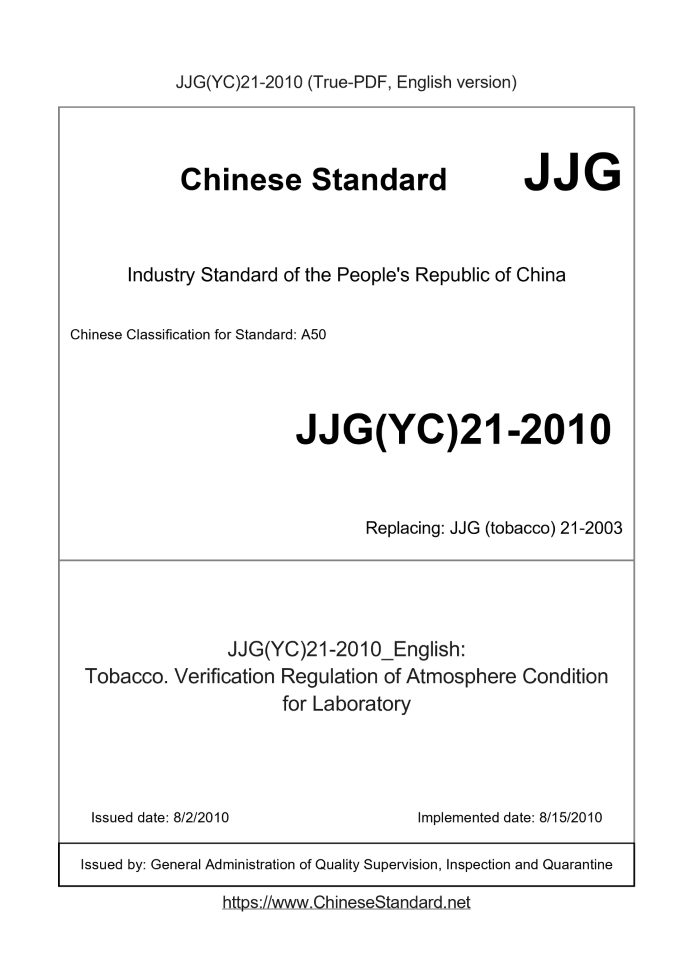 Basic dataStandard ID: JJG(YC)21-2010 (JJG(YC)21-2010)Description (Translated English): Tobacco. Verification Regulation of Atmosphere Condition for Laboratory Sector / Industry: Metrology & Measurement Industry Standard Classification of Chinese Standard: A50 Classification of International Standard: 17.02 Word Count Estimation: 10,134 Date of Issue: 8/2/2010 Date of Implementation: 8/15/2010 Older Standard (superseded by this standard): JJG (tobacco) 21-2003 Quoted Standard: GB/T 10739-2002; GB/T 16447-2004 Regulation (derived from): ?State-Tobacco-Science [2010] 269 Issuing agency(ies): General Administration of Quality Supervision, Inspection and Quarantine Summary: This standard applies to new construction, the use of tobacco and system overhaul after initial verification atmospheric temperature and humidity laboratory follow-up test and use test. Tips & Frequently Asked Questions:Question 1: How long will the true-PDF of JJG(YC)21-2010_English be delivered?Answer: Upon your order, we will start to translate JJG(YC)21-2010_English as soon as possible, and keep you informed of the progress. The lead time is typically in 9 seconds (download/delivered in 9 seconds). The lengthier the document the longer the lead time.Question 2: Can I share the purchased PDF of JJG(YC)21-2010_English with my colleagues?Answer: Yes. The purchased PDF of JJG(YC)21-2010_English will be deemed to be sold to your employer/organization who actually pays for it, including your colleagues and your employer's intranet.Question 3: Does the price include tax/VAT?Answer: Yes. Our tax invoice, downloaded/delivered in 9 seconds, includes all tax/VAT and complies with 100+ countries' tax regulations (tax exempted in 100+ countries) -- See Avoidance of Double Taxation Agreements (DTAs): List of DTAs signed between Singapore and 100+ countriesQuestion 4: Do you accept my currency other than USD?Answer: Yes. If you need your currency to be printed on the invoice, please write an email to Sales@ChineseStandard.net. In 2 working-hours, we will create a special link for you to pay in any currencies. Otherwise, follow the normal steps: Add to Cart -- Checkout -- Select your currency to pay. |