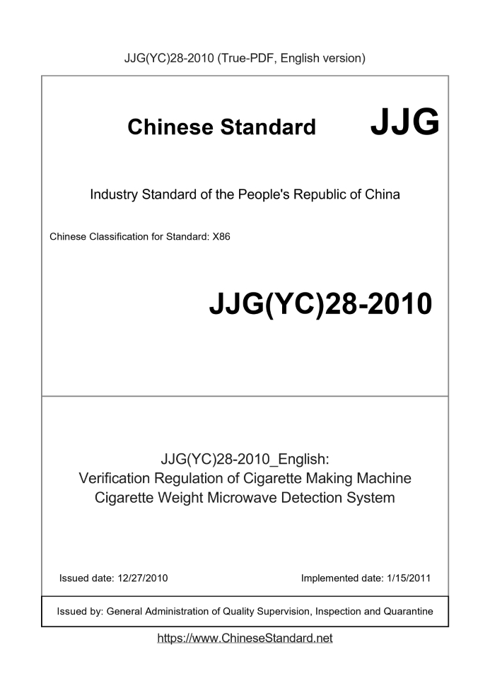 Basic dataStandard ID: JJG(YC)28-2010 (JJG(YC)28-2010)Description (Translated English): Verification Regulation of Cigarette Making Machine Cigarette Weight Microwave Detection System Sector / Industry: Metrology & Measurement Industry Standard Classification of Chinese Standard: X86 Classification of International Standard: 65.16 Word Count Estimation: 11,162 Date of Issue: 12/27/2010 Date of Implementation: 1/15/2011 Regulation (derived from): ?State-Tobacco-Science (2010) 446 Issuing agency(ies): General Administration of Quality Supervision, Inspection and Quarantine Summary: This standard applies to first test the quality of cigarette cigarette machine microwave detection system, follow-up testing and use Tips & Frequently Asked Questions:Question 1: How long will the true-PDF of JJG(YC)28-2010_English be delivered?Answer: Upon your order, we will start to translate JJG(YC)28-2010_English as soon as possible, and keep you informed of the progress. The lead time is typically in 9 seconds (download/delivered in 9 seconds). The lengthier the document the longer the lead time.Question 2: Can I share the purchased PDF of JJG(YC)28-2010_English with my colleagues?Answer: Yes. The purchased PDF of JJG(YC)28-2010_English will be deemed to be sold to your employer/organization who actually pays for it, including your colleagues and your employer's intranet.Question 3: Does the price include tax/VAT?Answer: Yes. Our tax invoice, downloaded/delivered in 9 seconds, includes all tax/VAT and complies with 100+ countries' tax regulations (tax exempted in 100+ countries) -- See Avoidance of Double Taxation Agreements (DTAs): List of DTAs signed between Singapore and 100+ countriesQuestion 4: Do you accept my currency other than USD?Answer: Yes. If you need your currency to be printed on the invoice, please write an email to Sales@ChineseStandard.net. In 2 working-hours, we will create a special link for you to pay in any currencies. Otherwise, follow the normal steps: Add to Cart -- Checkout -- Select your currency to pay. |