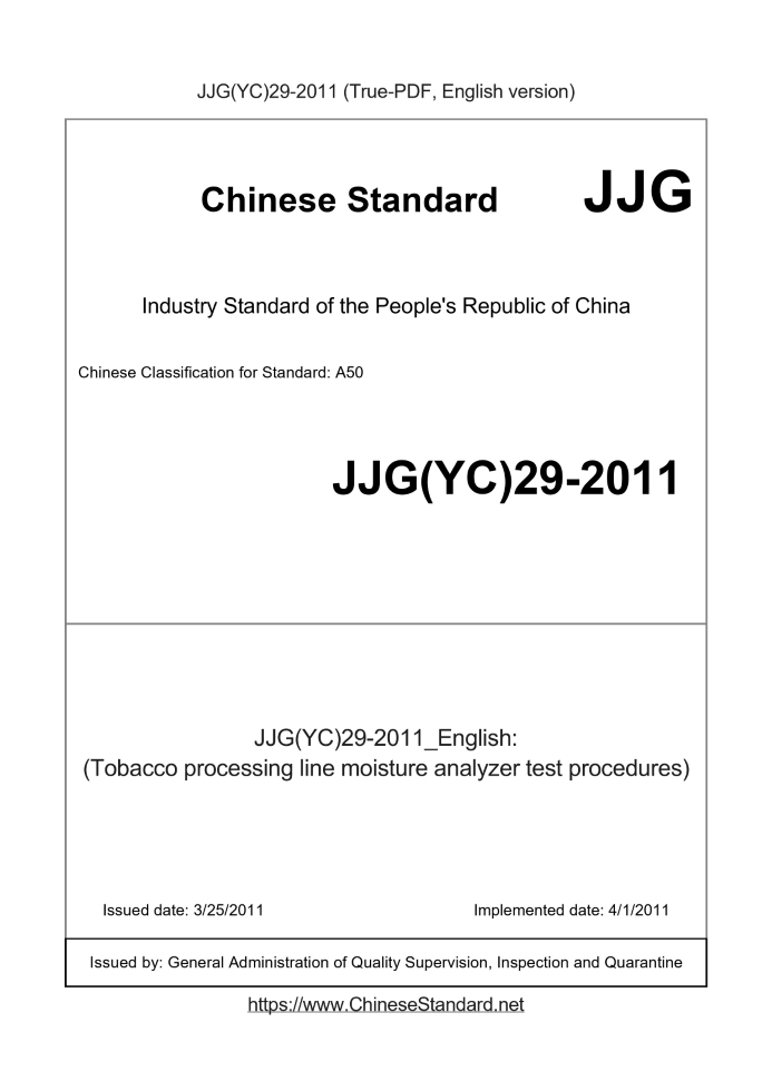 Basic dataStandard ID: JJG(YC)29-2011 (JJG(YC)29-2011)Description (Translated English): (Tobacco processing line moisture analyzer test procedures) Sector / Industry: Metrology & Measurement Industry Standard Classification of Chinese Standard: A50 Classification of International Standard: 17.02 Word Count Estimation: 14,142 Date of Issue: 3/25/2011 Date of Implementation: 4/1/2011 Quoted Standard: JJG (tobacco) 10-1998; YC/T 31-1996 Regulation (derived from): ?State-Tobacco-Science [2011] 153 Issuing agency(ies): General Administration of Quality Supervision, Inspection and Quarantine Summary: This standard applies to tobacco processing line moisture analyzer (hereinafter referred to as moisture meter) of the initial verification, testing and use of the follow-up inspection. Tips & Frequently Asked Questions:Question 1: How long will the true-PDF of JJG(YC)29-2011_English be delivered?Answer: Upon your order, we will start to translate JJG(YC)29-2011_English as soon as possible, and keep you informed of the progress. The lead time is typically in 9 seconds (download/delivered in 9 seconds). The lengthier the document the longer the lead time.Question 2: Can I share the purchased PDF of JJG(YC)29-2011_English with my colleagues?Answer: Yes. The purchased PDF of JJG(YC)29-2011_English will be deemed to be sold to your employer/organization who actually pays for it, including your colleagues and your employer's intranet.Question 3: Does the price include tax/VAT?Answer: Yes. Our tax invoice, downloaded/delivered in 9 seconds, includes all tax/VAT and complies with 100+ countries' tax regulations (tax exempted in 100+ countries) -- See Avoidance of Double Taxation Agreements (DTAs): List of DTAs signed between Singapore and 100+ countriesQuestion 4: Do you accept my currency other than USD?Answer: Yes. If you need your currency to be printed on the invoice, please write an email to Sales@ChineseStandard.net. In 2 working-hours, we will create a special link for you to pay in any currencies. Otherwise, follow the normal steps: Add to Cart -- Checkout -- Select your currency to pay. |