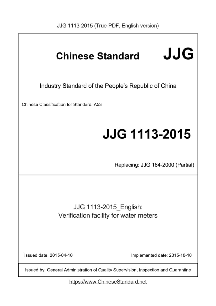 Delivery: <= 4 days. True-PDF full-copy in English will be manually translated and delivered via email. JJG 1113-2015: Verification facility for water meters Status: Valid