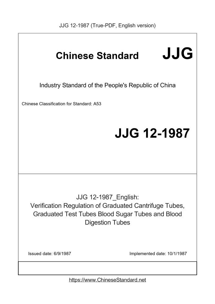 Delivery: <= 5 days. True-PDF full-copy in English will be manually translated and delivered via email. JJG 12-1987: Verification Regulation of Graduated Cantrifuge Tubes, Graduated Test Tubes Blood Sugar Tubes and Blood Digestion Tubes Status: Obsolete
