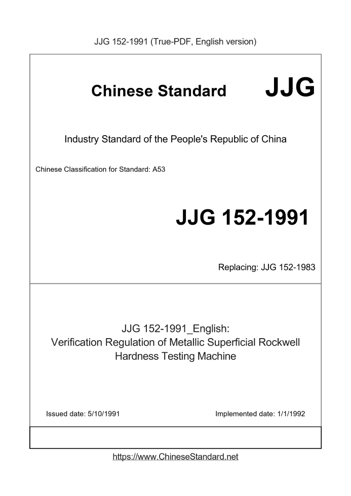 Delivery: <= 3 days. True-PDF full-copy in English will be manually translated and delivered via email. JJG 152-1991: Verification Regulation of Metallic Superficial Rockwell Hardness Testing Machine Status: Obsolete JJG 152: Historical versions