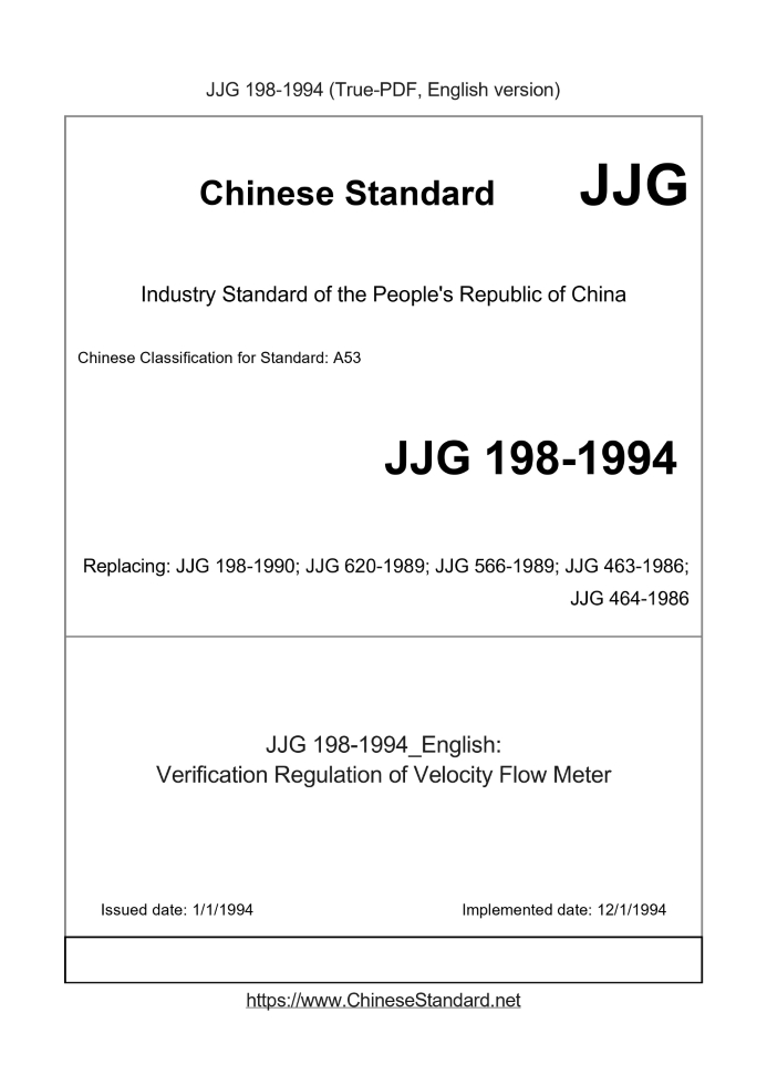 Delivery: <= 3 days. True-PDF full-copy in English will be manually translated and delivered via email. JJG 198-1994: Verification Regulation of Velocity Flow Meter Status: Obsolete JJG 198: Historical versions
