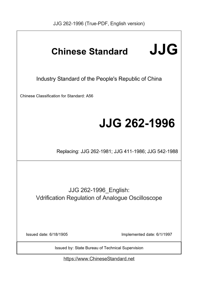 Delivery: <= 5 days. True-PDF full-copy in English will be manually translated and delivered via email. JJG 262-1996: Vdrification Regulation of Analogue Oscilloscope JJG 262: Historical versions