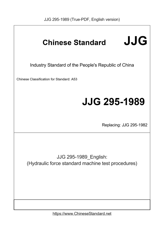 Delivery: <= 3 days. True-PDF full-copy in English will be manually translated and delivered via email. JJG 295-1989: (Hydraulic force standard machine test procedures) Status: Obsolete