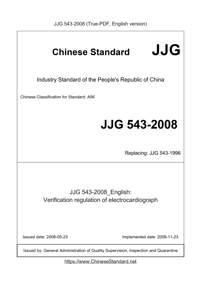 Delivery: <= 5 days. True-PDF full-copy in English will be manually translated and delivered via email. JJG 543-2008: Verification regulation of electrocardiograph Status: Valid JJG 543: Historical versions