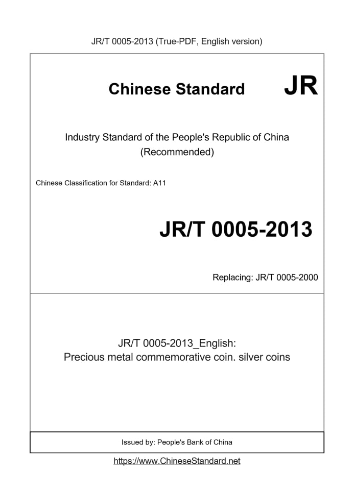 Delivery: <= 3 days. True-PDF full-copy in English will be manually translated and delivered via email. JR/T 0005-2013: Precious metal commemorative coin. silver coins Status: Valid JR/T 0005: Historical versions