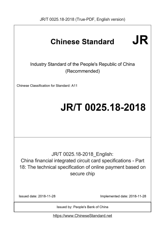 Delivery: <= 4 days. True-PDF full-copy in English will be manually translated and delivered via email. JR/T 0025.18-2018: China financial integrated circuit card specifications - Part 18: The technical specification of online payment based on secure chip Status: Valid