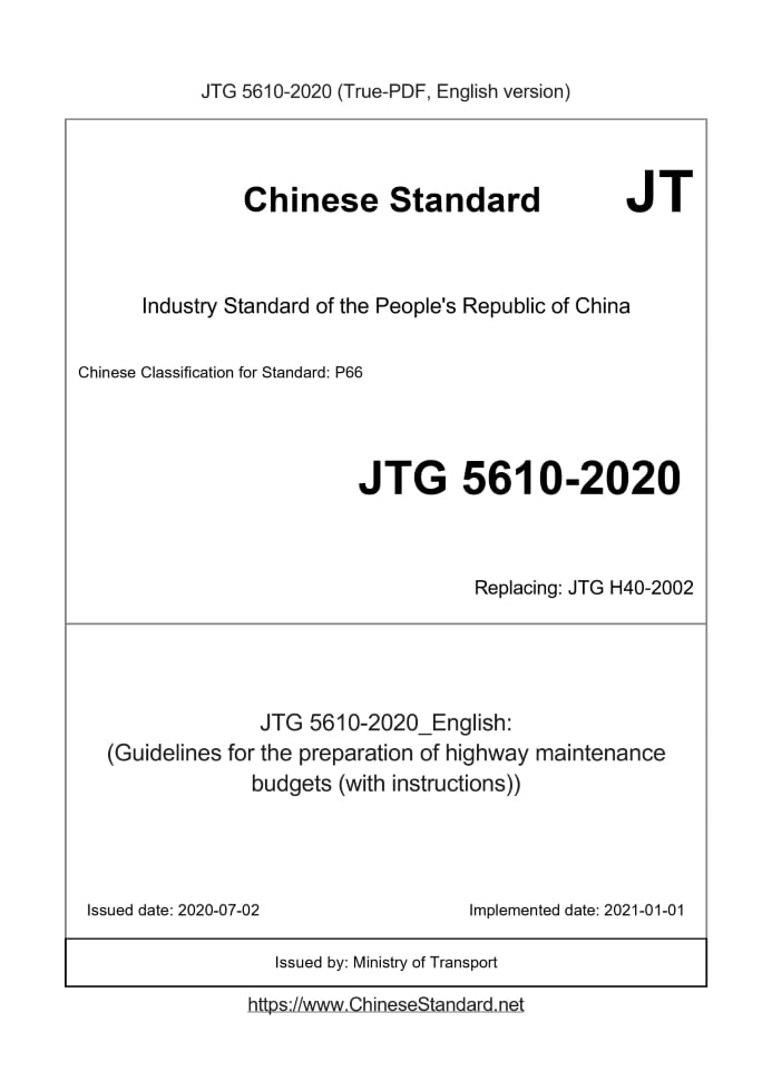 Delivery: <= 9 days. True-PDF full-copy in English will be manually translated and delivered via email. JTG5610-2020: (Guidelines for the preparation of highway maintenance budgets (with instructions)) Status: Valid