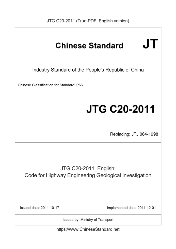 Delivery: <= 13 days. True-PDF full-copy in English will be manually translated and delivered via email. JTGC20-2011: Code for Highway Engineering Geological Investigation Status: Valid