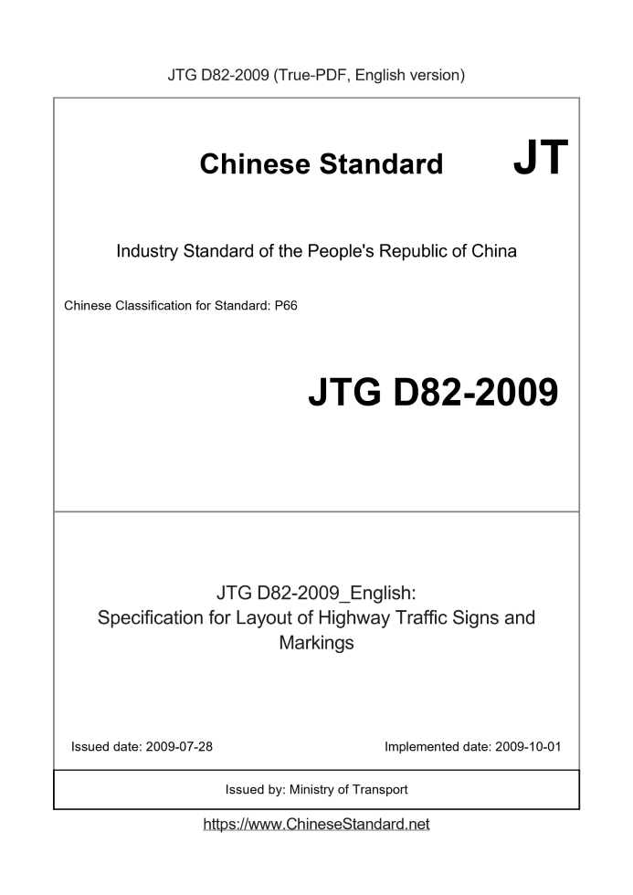 Basic dataStandard ID: JTG D82-2009 (JTGD82-2009)Description (Translated English): Specification for Layout of Highway Traffic Signs and Markings Sector / Industry: Highway & Transportation Industry Standard Classification of Chinese Standard: P66 Classification of International Standard: 93.080.30 Word Count Estimation: 250,284 Date of Issue: 2009-07-28 Date of Implementation: 2009-10-01 Regulation (derived from): Ministry of Transport Notice No. 28 of 2009 Issuing agency(ies): Ministry of Transport Summary: This standard applies to new construction and renovation and expansion of road traffic signs and markings settings. Tips & Frequently Asked Questions:Question 1: How long will the true-PDF of JTGD82-2009_English be delivered?Answer: Upon your order, we will start to translate JTGD82-2009_English as soon as possible, and keep you informed of the progress. The lead time is typically 1 ~ 3 working days. The lengthier the document the longer the lead time.Question 2: Can I share the purchased PDF of JTGD82-2009_English with my colleagues?Answer: Yes. The purchased PDF of JTGD82-2009_English will be deemed to be sold to your employer/organization who actually pays for it, including your colleagues and your employer's intranet.Question 3: Does the price include tax/VAT?Answer: Yes. Our tax invoice, downloaded/delivered in 9 seconds, includes all tax/VAT and complies with 100+ countries' tax regulations (tax exempted in 100+ countries) -- See Avoidance of Double Taxation Agreements (DTAs): List of DTAs signed between Singapore and 100+ countriesQuestion 4: Do you accept my currency other than USD?Answer: Yes. If you need your currency to be printed on the invoice, please write an email to Sales@ChineseStandard.net. In 2 working-hours, we will create a special link for you to pay in any currencies. Otherwise, follow the normal steps: Add to Cart -- Checkout -- Select your currency to pay. |