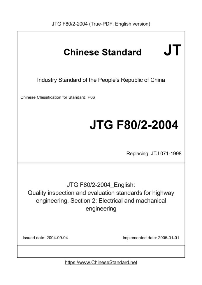 Basic dataStandard ID: JTG F80/2-2004 (JTGF80/2-2004)Description (Translated English): Quality inspection and evaluation standards for highway engineering. Section 2: Electrical and machanical engineering Sector / Industry: Highway & Transportation Industry Standard Classification of Chinese Standard: P66 Classification of International Standard: 93.080 Word Count Estimation: 108,142 Date of Issue: 2004-09-04 Date of Implementation: 2005-01-01 Older Standard (superseded by this standard): JTJ 071-1998 Regulation (derived from): Ministry of Transport Notice No. 14 of 2013 Summary: This standard applies to new and expanded highway traffic engineering electrical and mechanical items, electrical and mechanical engineering other highway projects can be implemented by reference. Tips & Frequently Asked Questions:Question 1: How long will the true-PDF of JTGF802-2004_English be delivered?Answer: Upon your order, we will start to translate JTGF802-2004_English as soon as possible, and keep you informed of the progress. The lead time is typically 1 ~ 3 working days. The lengthier the document the longer the lead time.Question 2: Can I share the purchased PDF of JTGF802-2004_English with my colleagues?Answer: Yes. The purchased PDF of JTGF802-2004_English will be deemed to be sold to your employer/organization who actually pays for it, including your colleagues and your employer's intranet.Question 3: Does the price include tax/VAT?Answer: Yes. Our tax invoice, downloaded/delivered in 9 seconds, includes all tax/VAT and complies with 100+ countries' tax regulations (tax exempted in 100+ countries) -- See Avoidance of Double Taxation Agreements (DTAs): List of DTAs signed between Singapore and 100+ countriesQuestion 4: Do you accept my currency other than USD?Answer: Yes. If you need your currency to be printed on the invoice, please write an email to Sales@ChineseStandard.net. In 2 working-hours, we will create a special link for you to pay in any currencies. Otherwise, follow the normal steps: Add to Cart -- Checkout -- Select your currency to pay. |
