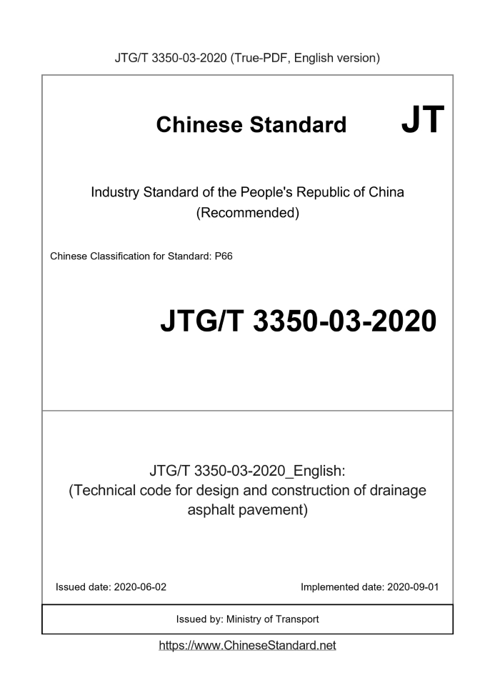 Delivery: <= 8 days. True-PDF full-copy in English will be manually translated and delivered via email. JTGT3350-03-2020: (Technical code for design and construction of drainage asphalt pavement) Status: Valid