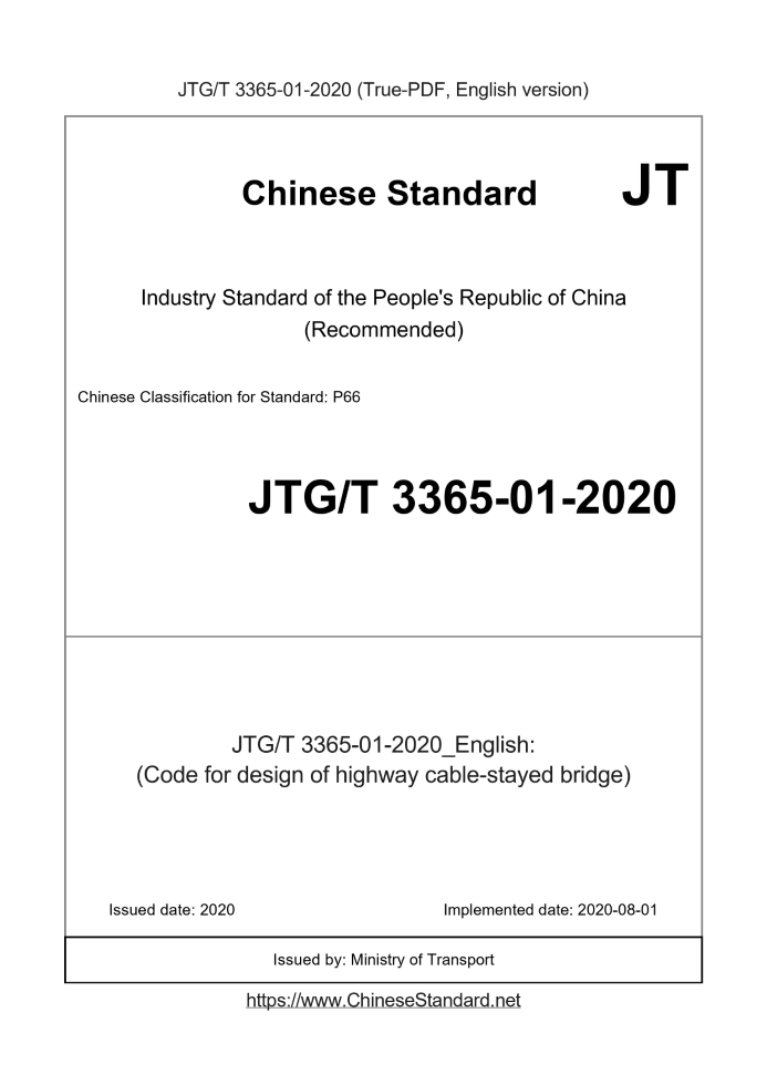Delivery: <= 8 days. True-PDF full-copy in English will be manually translated and delivered via email. JTGT3365-01-2020: (Code for design of highway cable-stayed bridge) Status: Valid