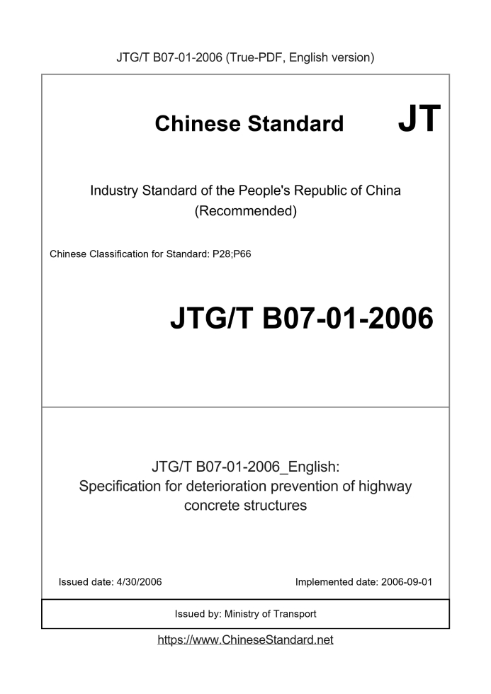 Basic dataStandard ID: JTG/T B07-01-2006 (JTG/TB07-01-2006)Description (Translated English): Specification for deterioration prevention of highway concrete structures Sector / Industry: Highway & Transportation Industry Standard (Recommended) Classification of Chinese Standard: P28;P66 Classification of International Standard: 93.080 Word Count Estimation: 60,621 Date of Issue: 4/30/2006 Date of Implementation: 2006-09-01 Issuing agency(ies): Ministry of Transport Summary: This standard applies to ordinary concrete construction of roads and bridges, tunnels, culverts, retaining structures and other engineering structures. This specification only considers the common environmental factors on corrosion of concrete structures, including the structure of the course of the water, frozen, and air pollutants (salt, sulfur dioxide, carbon dioxide extraordinary concentration, car exhaust) and other atmospheric effects. In contact with the soil and water containing chlorine, sulfate, carbonate, and other substances of chemical and physical effects, as well as regional highway deicing salt to cold concrete structure corrosion. This specification does not involve fatigue loading, vibration and wear and other mechanical effects on the durability of concrete, does not involve biological effects, radiation and electromagnetic effects. Highway corrosion durability of concrete structures design and construction, in addition to the requirements of this specification has been made outside, there should be in line with existing national standards and industry standards in the transportation of the relevant provisions. Required by this specification only basic requirements, the designer should be combined with the characteristics of their environment engineering and, if necessary, propose more specific requirements. |