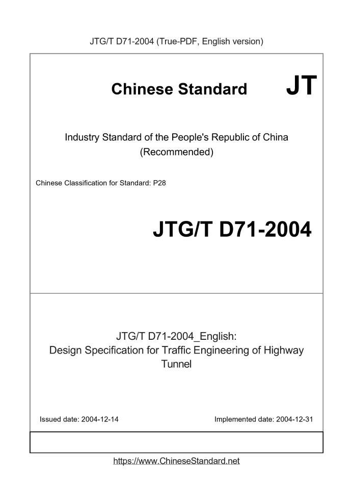 Delivery: <= 13 days. True-PDF full-copy in English will be manually translated and delivered via email. JTGTD71-2004: Design Specification for Traffic Engineering of Highway Tunnel Status: Valid