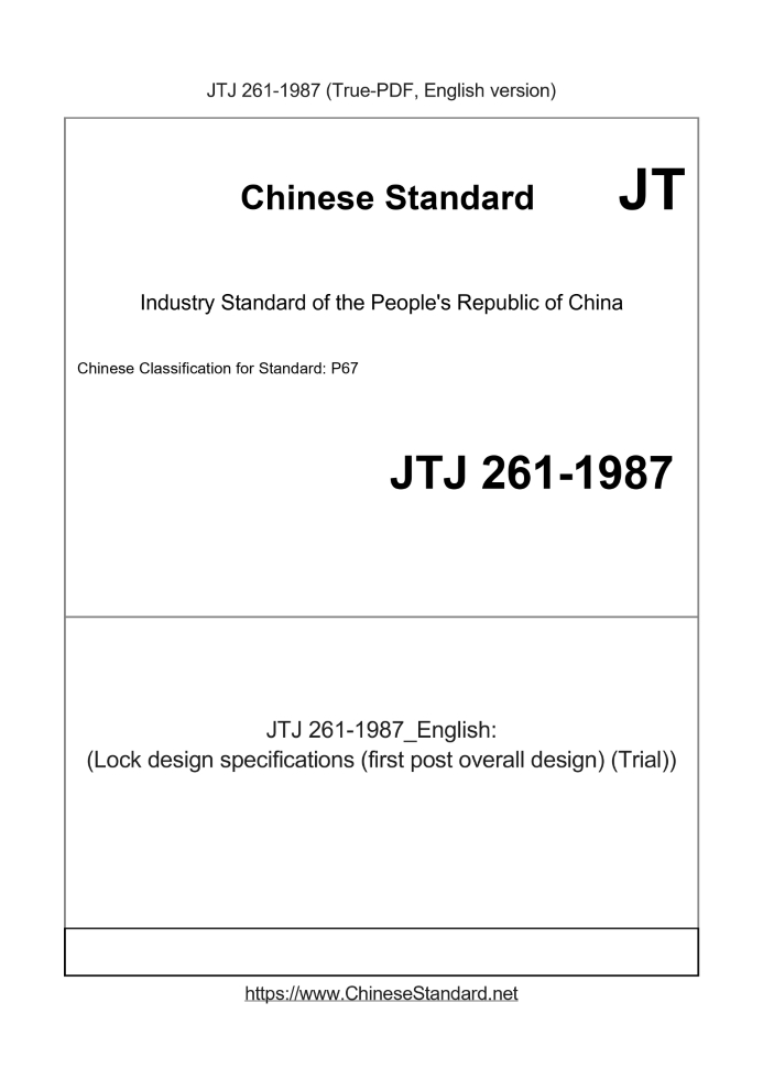 Basic dataStandard ID: JTJ 261-1987 (JTJ261-1987)Description (Translated English): (Lock design specifications (first post overall design) (Trial)) Sector / Industry: Highway & Transportation Industry Standard Classification of Chinese Standard: P67 Regulation (derived from): Delivery of water [2001] 485 |
