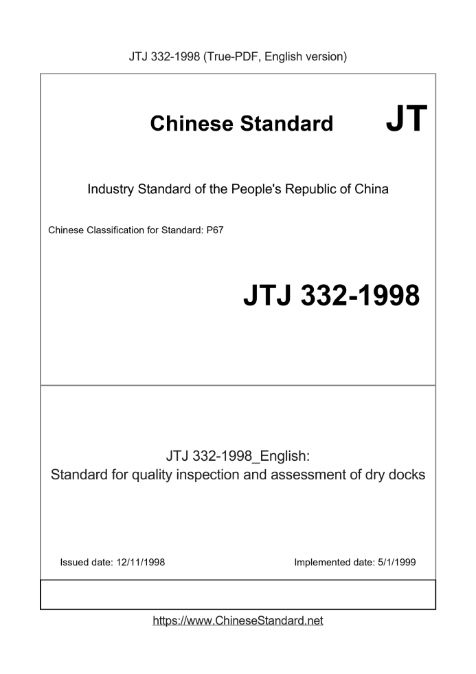 Basic dataStandard ID: JTJ 332-1998 (JTJ332-1998)Description (Translated English): Standard for quality inspection and assessment of dry docks Sector / Industry: Highway & Transportation Industry Standard Classification of Chinese Standard: P67 Word Count Estimation: 101,142 Date of Issue: 12/11/1998 Date of Implementation: 5/1/1999 Regulation (derived from): Ministry of Transport Notice 2008 No. 40 |