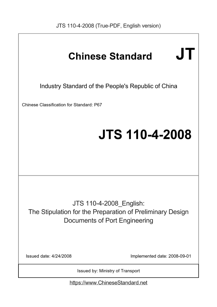 Delivery: <= 10 days. True-PDF full-copy in English will be manually translated and delivered via email. JTS110-4-2008: The Stipulation for the Preparation of Preliminary Design Documents of Port Engineering Status: Valid