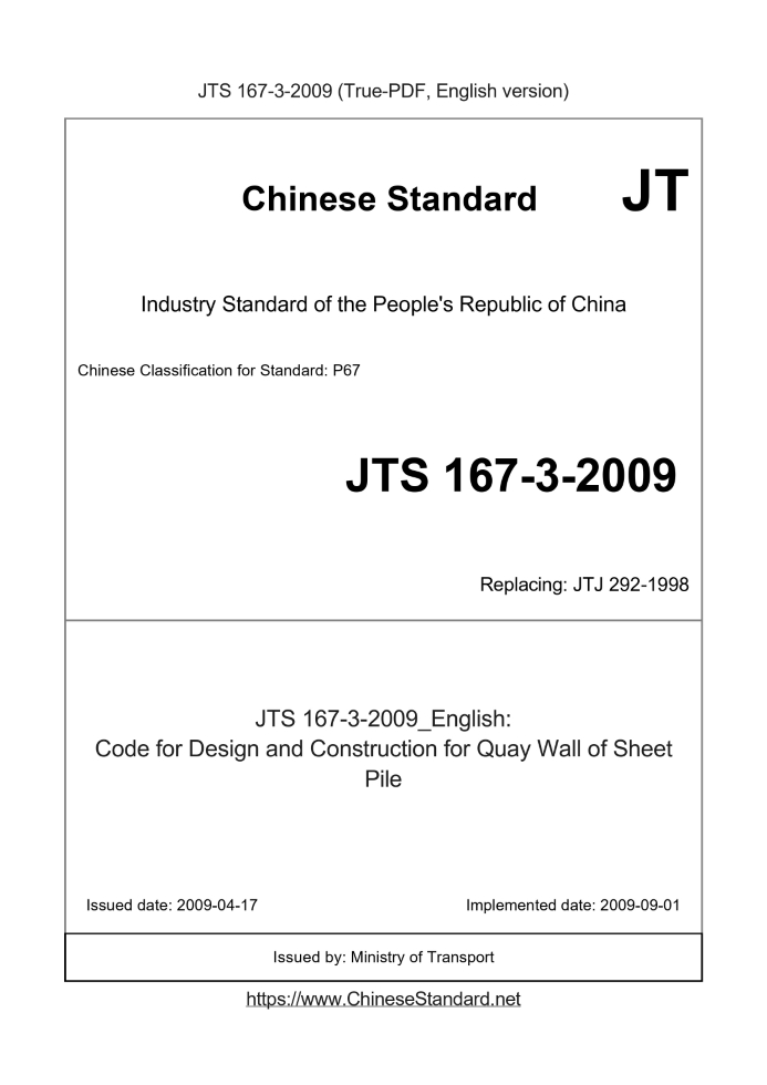 Basic dataStandard ID: JTS 167-3-2009 (JTS167-3-2009)Description (Translated English): Code for Design and Construction for Quay Wall of Sheet Pile Sector / Industry: Highway & Transportation Industry Standard Classification of Chinese Standard: P67 Classification of International Standard: 93.140 Word Count Estimation: 73,750 Date of Issue: 2009-04-17 Date of Implementation: 2009-09-01 Older Standard (superseded by this standard): JTJ 292-1998 Regulation (derived from): Ministry of Transport Notice No. 14 of 2009 Issuing agency(ies): Ministry of Transport Summary: This standard applies to new construction, expansion or alteration of the sheet pile wharf engineering design and construction. Using sheet pile cofferdam structure revetment and other design and construction, reference may be executed. |
