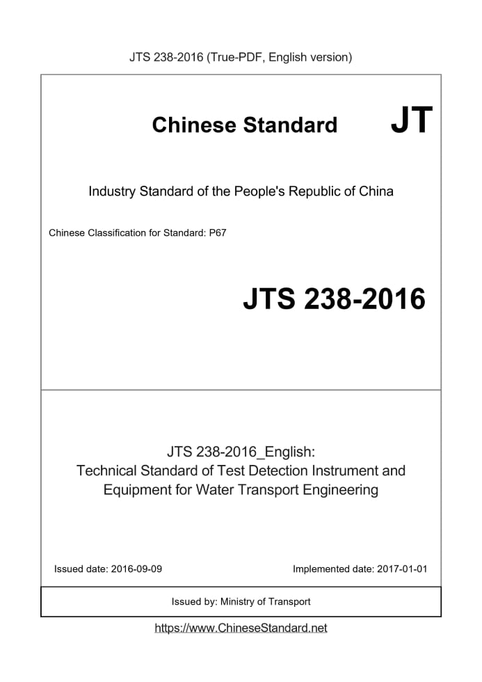 Delivery: <= 9 days. True-PDF full-copy in English will be manually translated and delivered via email. JTS238-2016: Technical Standard of Test Detection Instrument and Equipment for Water Transport Engineering Status: Valid