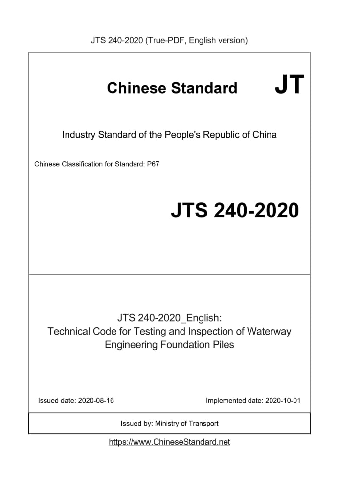 Delivery: <= 10 days. True-PDF full-copy in English will be manually translated and delivered via email. JTS240-2020: Technical Code for Testing and Inspection of Waterway Engineering Foundation Piles Status: Valid