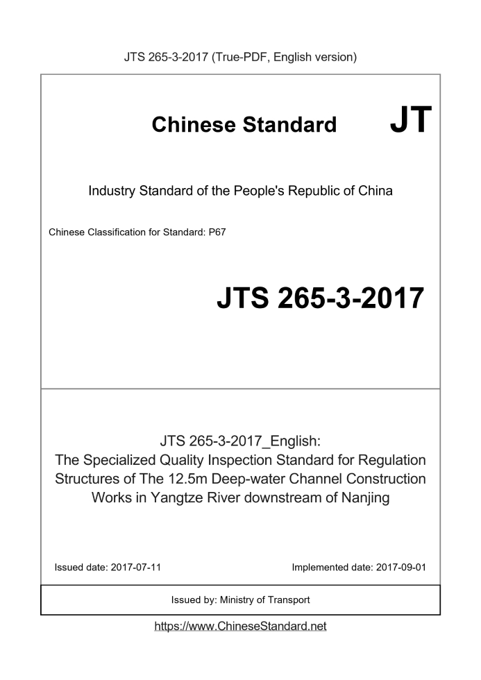 Delivery: <= 6 days. True-PDF full-copy in English will be manually translated and delivered via email. JTS265-3-2017: The Specialized Quality Inspection Standard for Regulation Structures of The 12.5m Deep-water Channel Construction Works in Yangtze River downstream of Nanjing Status: Valid