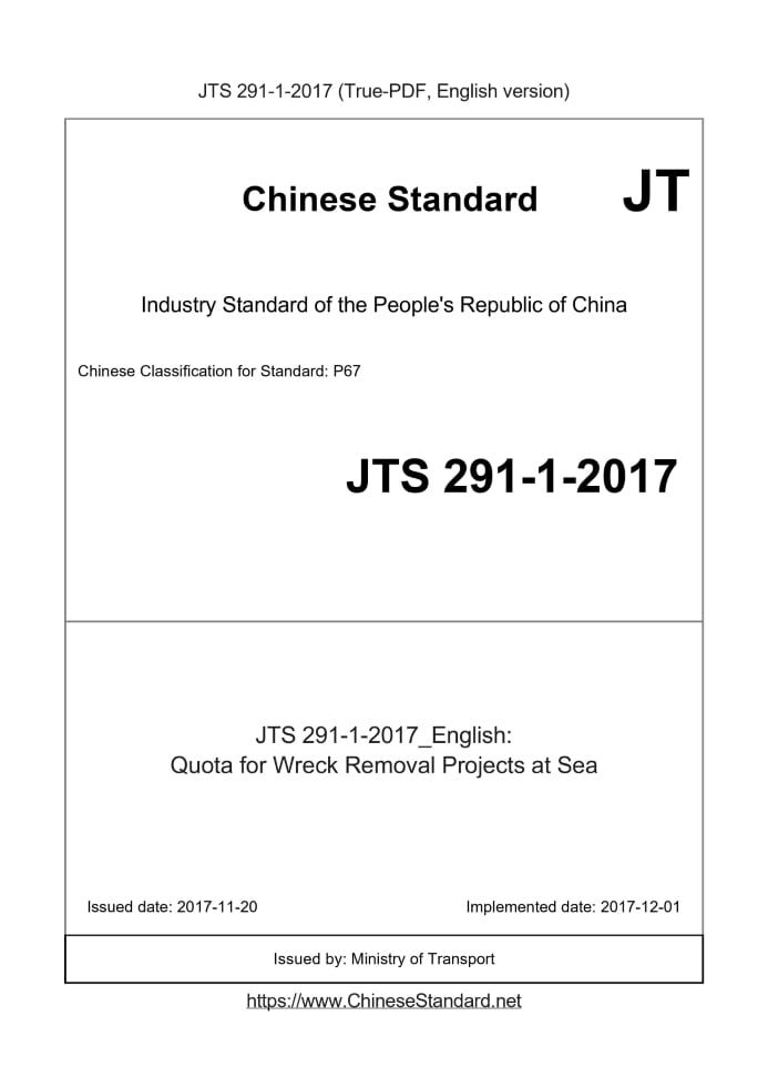 Delivery: <= 6 days. True-PDF full-copy in English will be manually translated and delivered via email. JTS291-1-2017: Quota for Wreck Removal Projects at Sea Status: Valid
