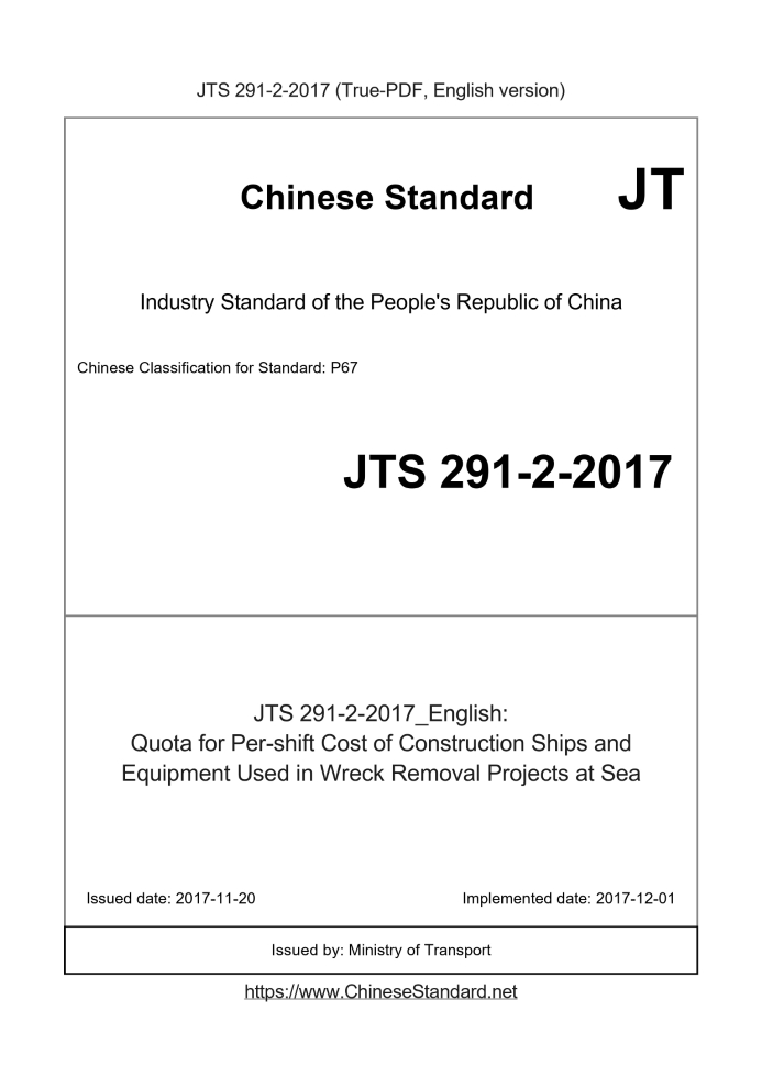 Delivery: <= 4 days. True-PDF full-copy in English will be manually translated and delivered via email. JTS291-2-2017: Quota for Per-shift Cost of Construction Ships and Equipment Used in Wreck Removal Projects at Sea Status: Valid