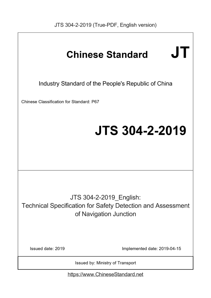 Delivery: <= 8 days. True-PDF full-copy in English will be manually translated and delivered via email. JTS304-2-2019: Technical Specification for Safety Detection and Assessment of Navigation Junction Status: Valid