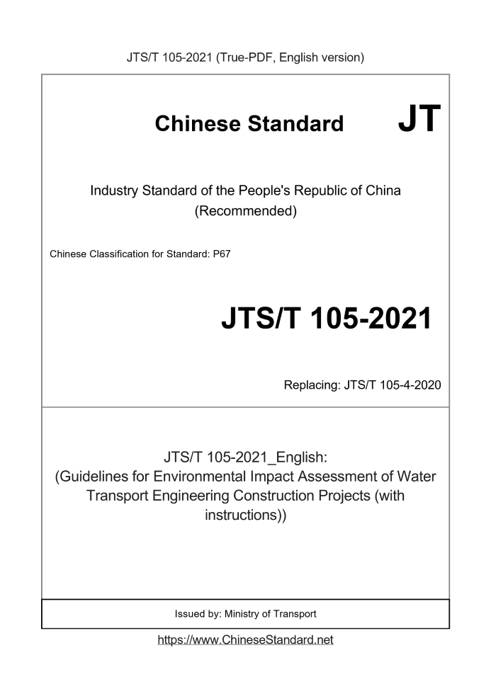 Delivery: <= 8 days. True-PDF full-copy in English will be manually translated and delivered via email. JTST105-2021: (Guidelines for Environmental Impact Assessment of Water Transport Engineering Construction Projects (with instructions)) Status: Valid JTST105: Historical versions