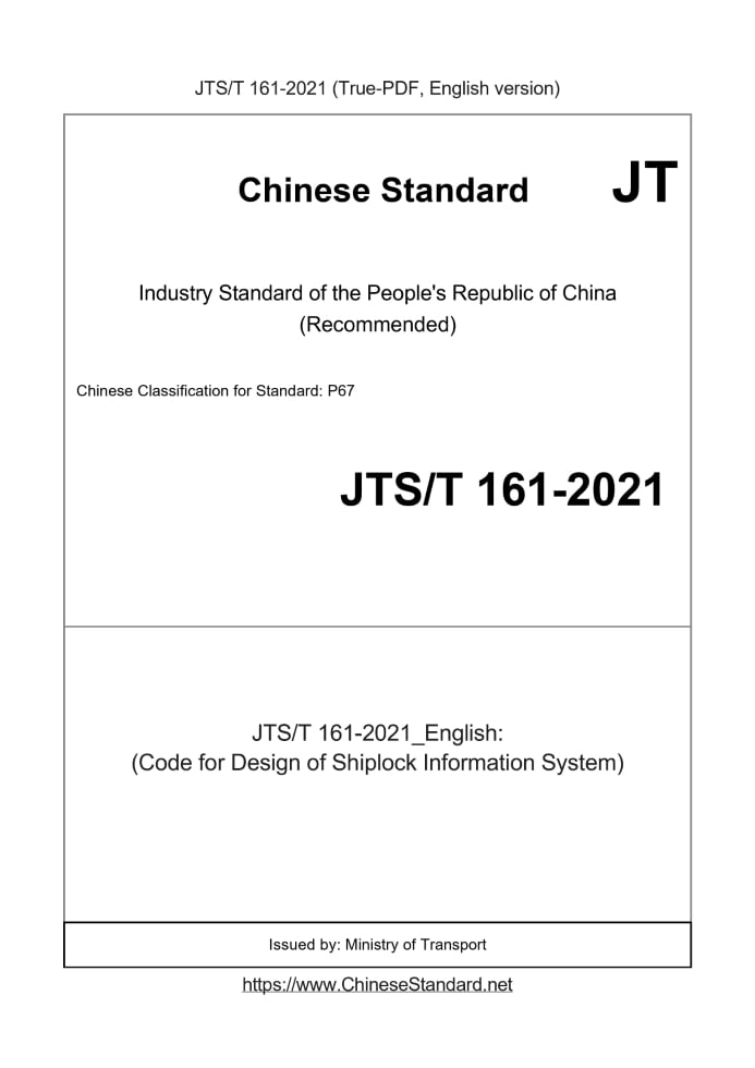 Delivery: <= 7 days. True-PDF full-copy in English will be manually translated and delivered via email. JTST161-2021: (Code for Design of Shiplock Information System) Status: Valid