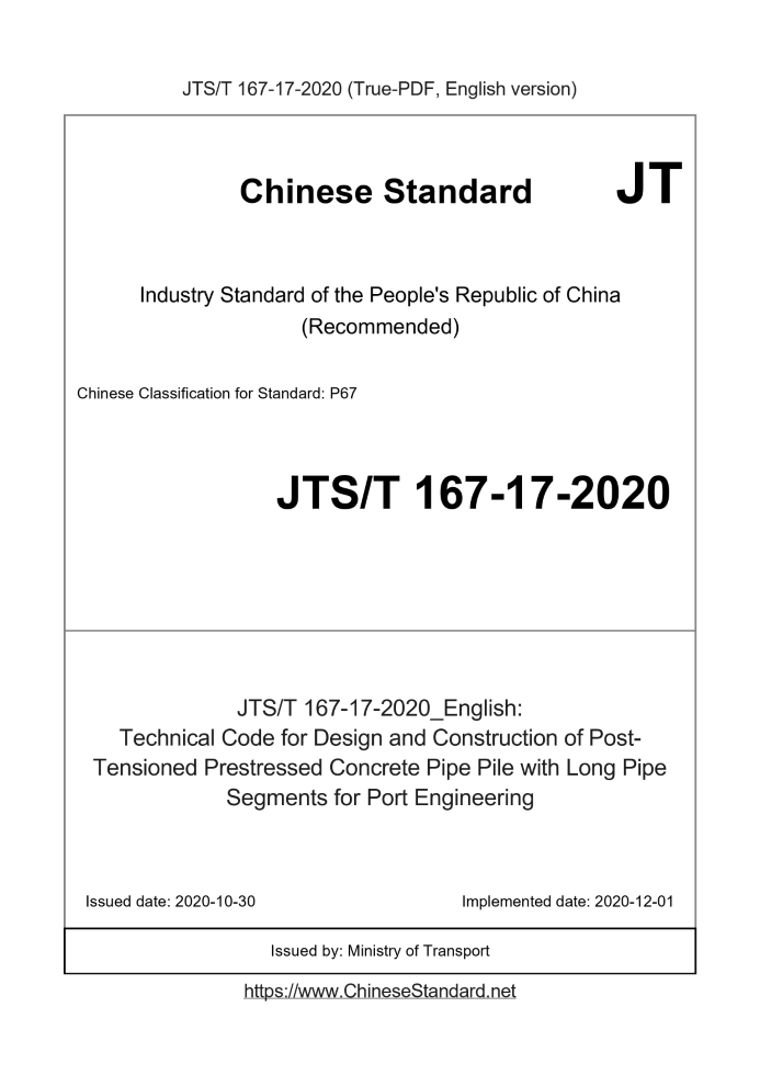 Delivery: <= 7 days. True-PDF full-copy in English will be manually translated and delivered via email. JTST167-17-2020: Technical Code for Design and Construction of Post-Tensioned Prestressed Concrete Pipe Pile with Long Pipe Segments for Port Engineering Status: Valid