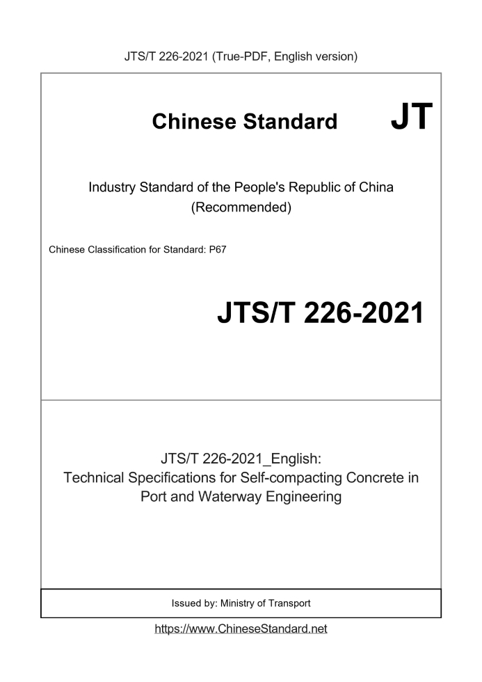 Delivery: <= 7 days. True-PDF full-copy in English will be manually translated and delivered via email. JTST226-2021: Technical Specifications for Self-compacting Concrete in Port and Waterway Engineering Status: Valid