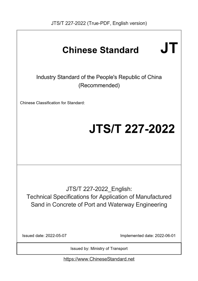 Delivery: <= 6 days. True-PDF full-copy in English will be manually translated and delivered via email. JTST227-2022: Technical Specifications for Application of Manufactured Sand in Concrete of Port and Waterway Engineering Status: Valid
