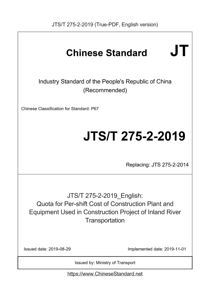 Basic dataStandard ID: JTS/T 275-2-2019 (JTS/T275-2-2019)Description (Translated English): Quota for Per-shift Cost of Construction Plant and Equipment Used in Construction Project of Inland River Transportation Sector / Industry: Highway & Transportation Industry Standard (Recommended) Classification of Chinese Standard: P67 Word Count Estimation: 138,156 Date of Issue: 2019-08-29 Date of Implementation: 2019-11-01 Older Standard (superseded by this standard): JTS 275-2-2014 Regulation (derived from): Natural Resources Department Announcement No. 7 of 2019 Issuing agency(ies): Ministry of Transport Tips & Frequently Asked Questions:Question 1: How long will the true-PDF of JTST275-2-2019_English be delivered?Answer: Upon your order, we will start to translate JTST275-2-2019_English as soon as possible, and keep you informed of the progress. The lead time is typically 1 ~ 3 working days. The lengthier the document the longer the lead time.Question 2: Can I share the purchased PDF of JTST275-2-2019_English with my colleagues?Answer: Yes. The purchased PDF of JTST275-2-2019_English will be deemed to be sold to your employer/organization who actually pays for it, including your colleagues and your employer's intranet.Question 3: Does the price include tax/VAT?Answer: Yes. Our tax invoice, downloaded/delivered in 9 seconds, includes all tax/VAT and complies with 100+ countries' tax regulations (tax exempted in 100+ countries) -- See Avoidance of Double Taxation Agreements (DTAs): List of DTAs signed between Singapore and 100+ countriesQuestion 4: Do you accept my currency other than USD?Answer: Yes. If you need your currency to be printed on the invoice, please write an email to Sales@ChineseStandard.net. In 2 working-hours, we will create a special link for you to pay in any currencies. Otherwise, follow the normal steps: Add to Cart -- Checkout -- Select your currency to pay. |