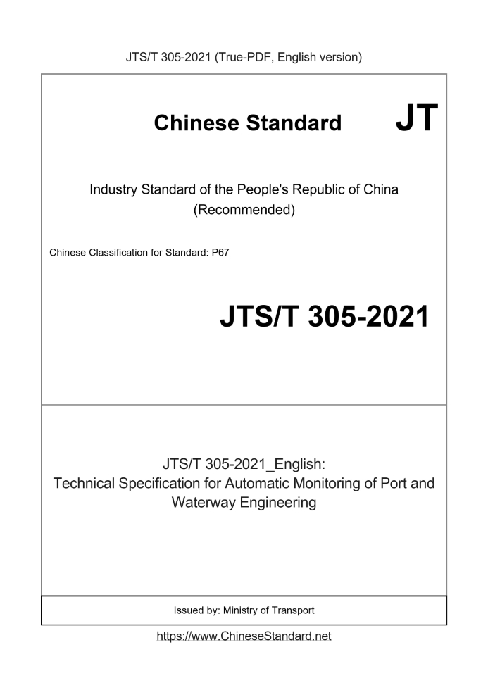 Delivery: <= 6 days. True-PDF full-copy in English will be manually translated and delivered via email. JTST305-2021: Technical Specification for Automatic Monitoring of Port and Waterway Engineering Status: Valid