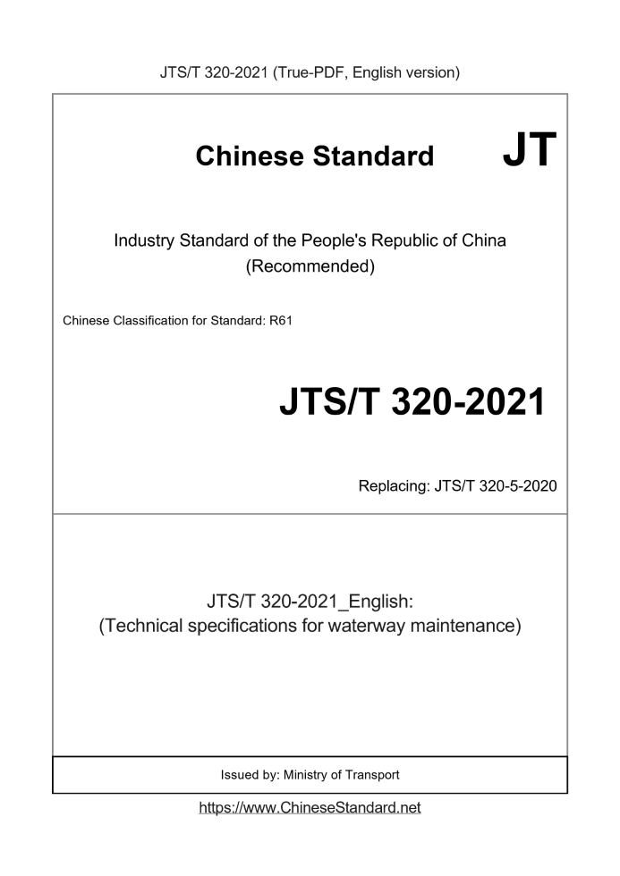 Delivery: <= 7 days. True-PDF full-copy in English will be manually translated and delivered via email. JTST320-2021: (Technical specifications for waterway maintenance) Status: Valid JTST320: Historical versions