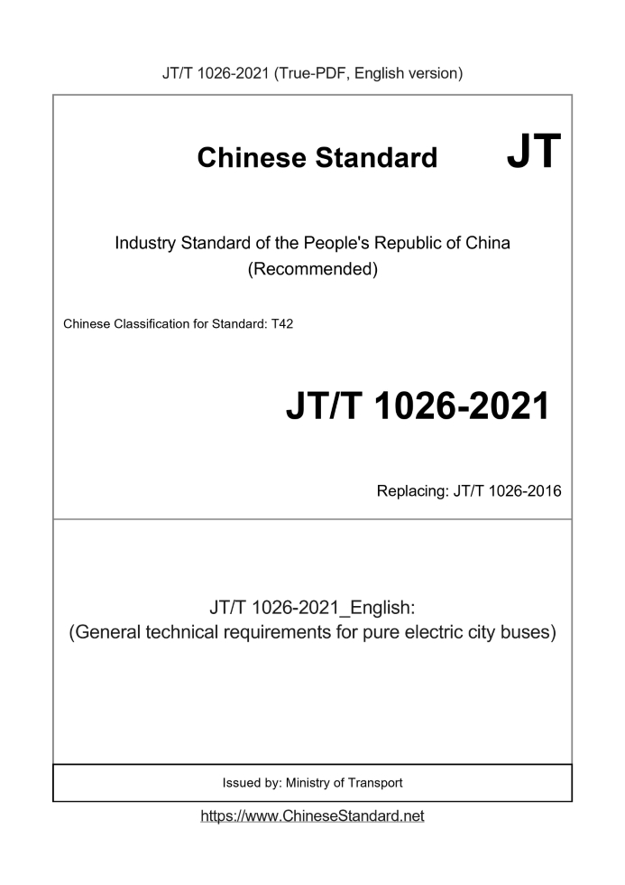 Delivery: <= 3 days. True-PDF full-copy in English will be manually translated and delivered via email. JT/T 1026-2021: (General technical requirements for pure electric city buses) Status: Valid JT/T 1026: Historical versions