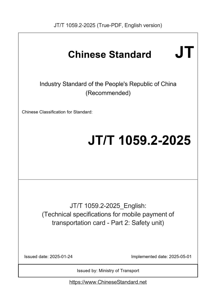 Delivery: <= 8 days. True-PDF full-copy in English will be manually translated and delivered via email. JT/T 1059.2-2025: (Technical specifications for mobile payment of transportation card - Part 2: Safety unit) Status: Valid JT/T 1059.2: Historical versions