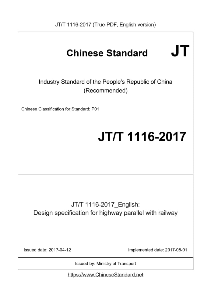 Delivery: <= 4 days. True-PDF full-copy in English will be manually translated and delivered via email. JT/T 1116-2017: Design specification for highway parallel with railway Status: Valid