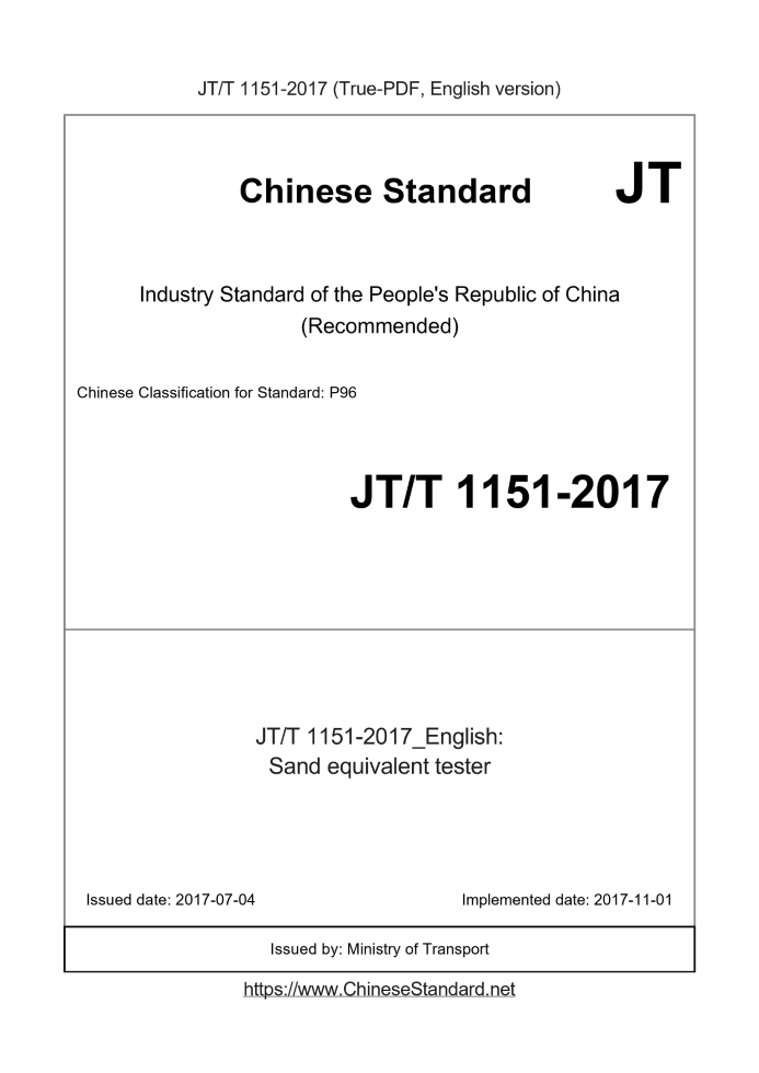 Delivery: <= 4 days. True-PDF full-copy in English will be manually translated and delivered via email. JT/T 1151-2017: Sand equivalent tester Status: Valid